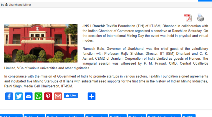 9th IME – 9th International Mining Expo 2022 – TEXMiN Foundation [Indian Institute of Technology (Indian School of Mines), Dhanbad] together with their incubatee’s Bidaal and Climate-B Ventures Pvt Ltd